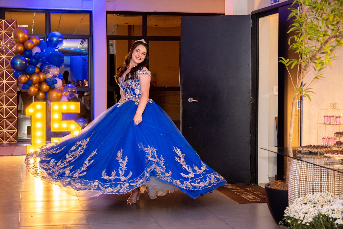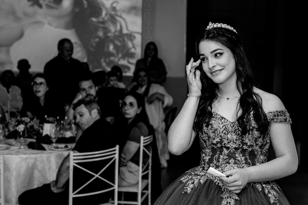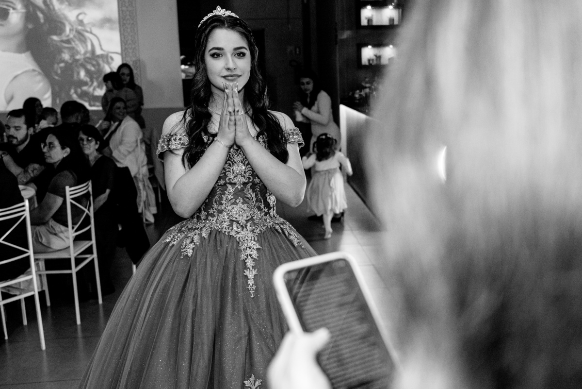 Tem algo muito especial em chegar antes, ter o salão só pra gente e fotografar a debutante ali, inteira e suuuper animada.
